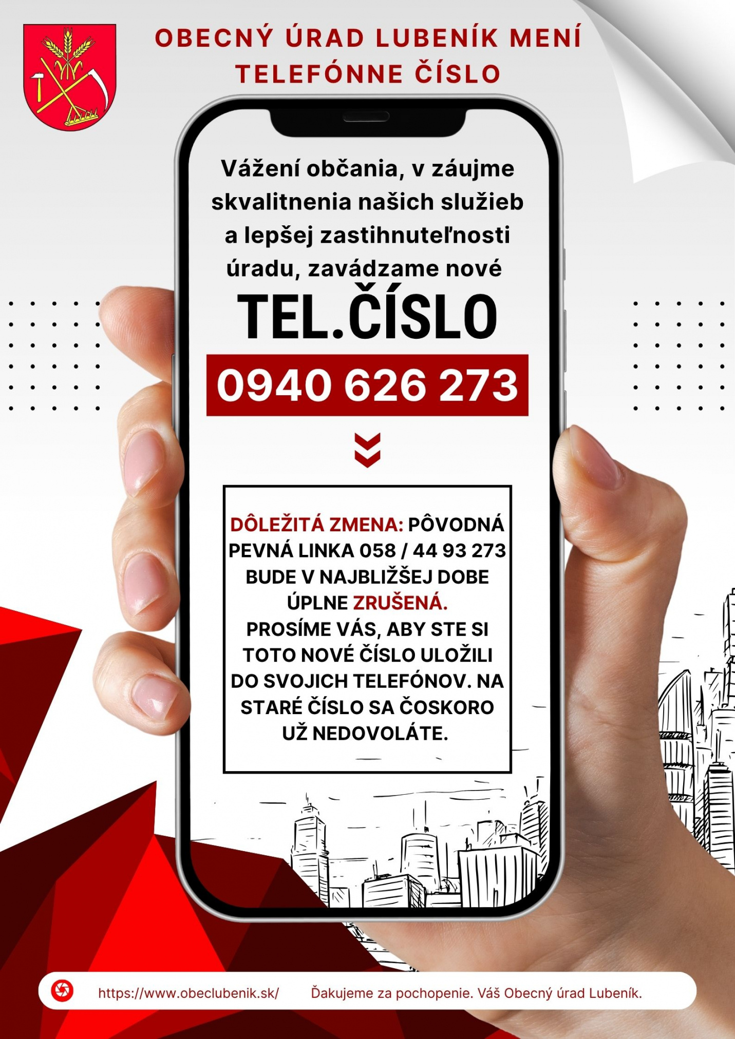 ⚠️ DÔLEŽITÁ ZMENA: Pôvodná pevná linka 058 / 44 93 273 bude v najbližšej dobe úplne zrušená. Prosíme Vás, aby ste si toto nové číslo uložili do svojich telefónov. Na staré číslo sa čoskoro už nedovoláte. Ďakujeme za pochopenie! Váš Obecný úrad Lubeník.