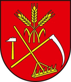 V  červenom štíte strieborná kosa na zlatom ľavošikmom kosisku prekríženom zlatými šikmými sklonenými hrabľami.To všetko sprevádzané vpravo strieborným kladivom na zlatej rukoväti a prevýšené tromi zlatými klasmi. Poľnohospodársky motív podľa pečatidla obce z roku 1833.